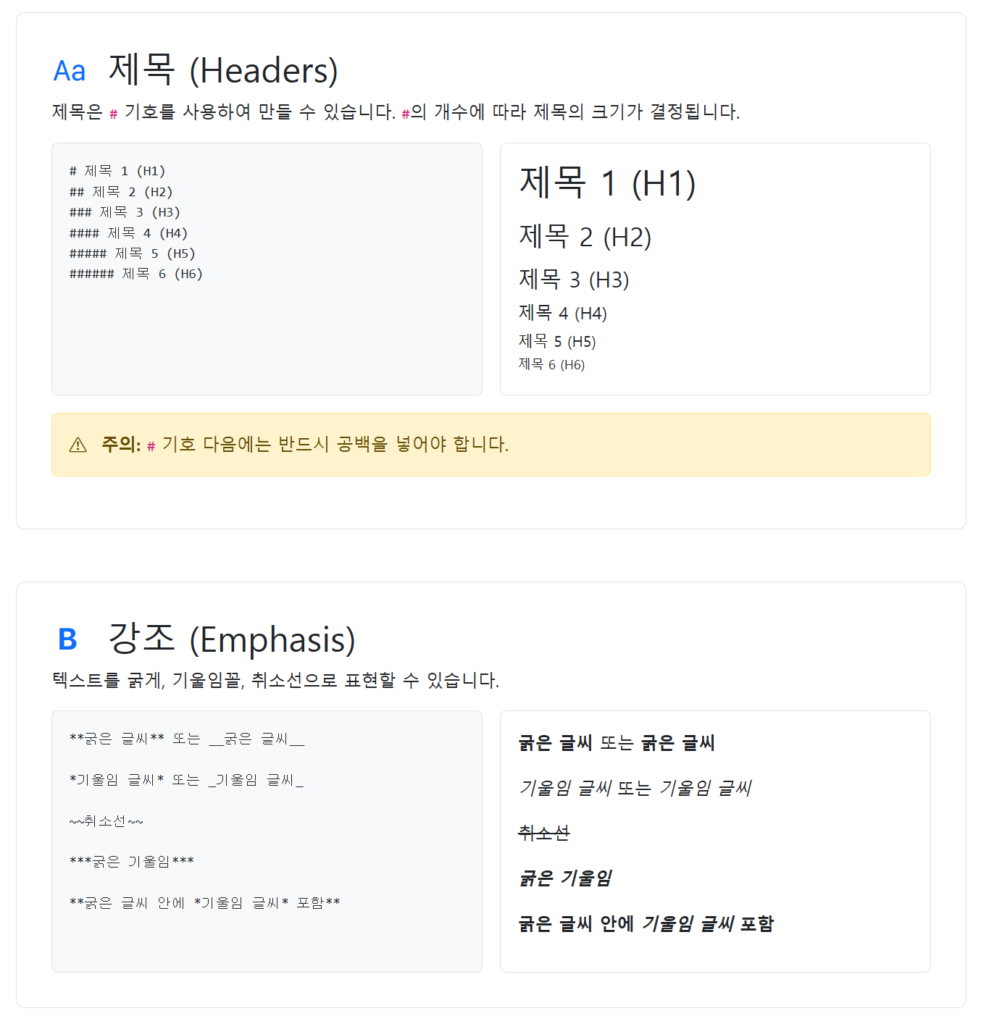 • 제목: 문단 앞에 샵(###)을 붙여 위계 설정